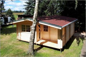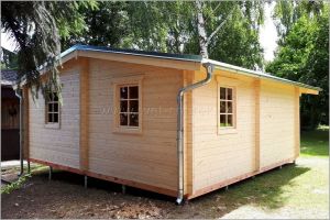 Srubová rekreační chata Deny 70. Síla stěny 70, samonosný zesílený rám a zemní vruty, zateplení rámu, okapový systém pozink, střešní krytina kanadský šindel IKO Cambridge Xpress Riviera red.