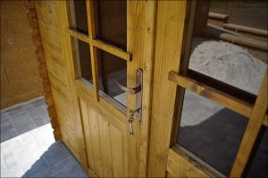 Zahradní chatka B42, síla stěny 28 mm, kanadský šindel, oplechování, okapový systém lakovaný RAL 7016 antracit, nátěr Remmers HK Lasur dub rustikální