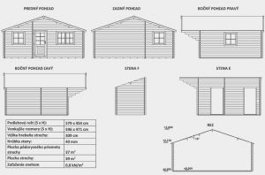Víkendová srubová chata 579x454 cm se třemi místnostmi uvnitř. Místnosti nejsou odděleny dveřmi. Síla stěny 40 mm.