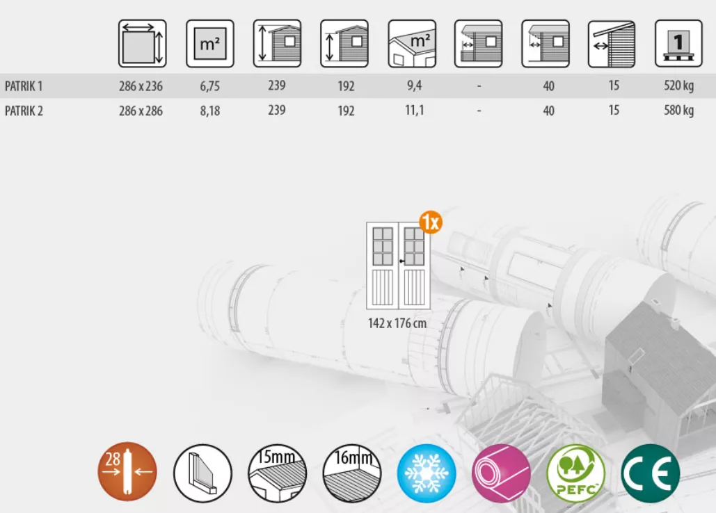 Zahradní domek 286x236 cm s dvojitými dveřmi.Síla stěny 28mm.